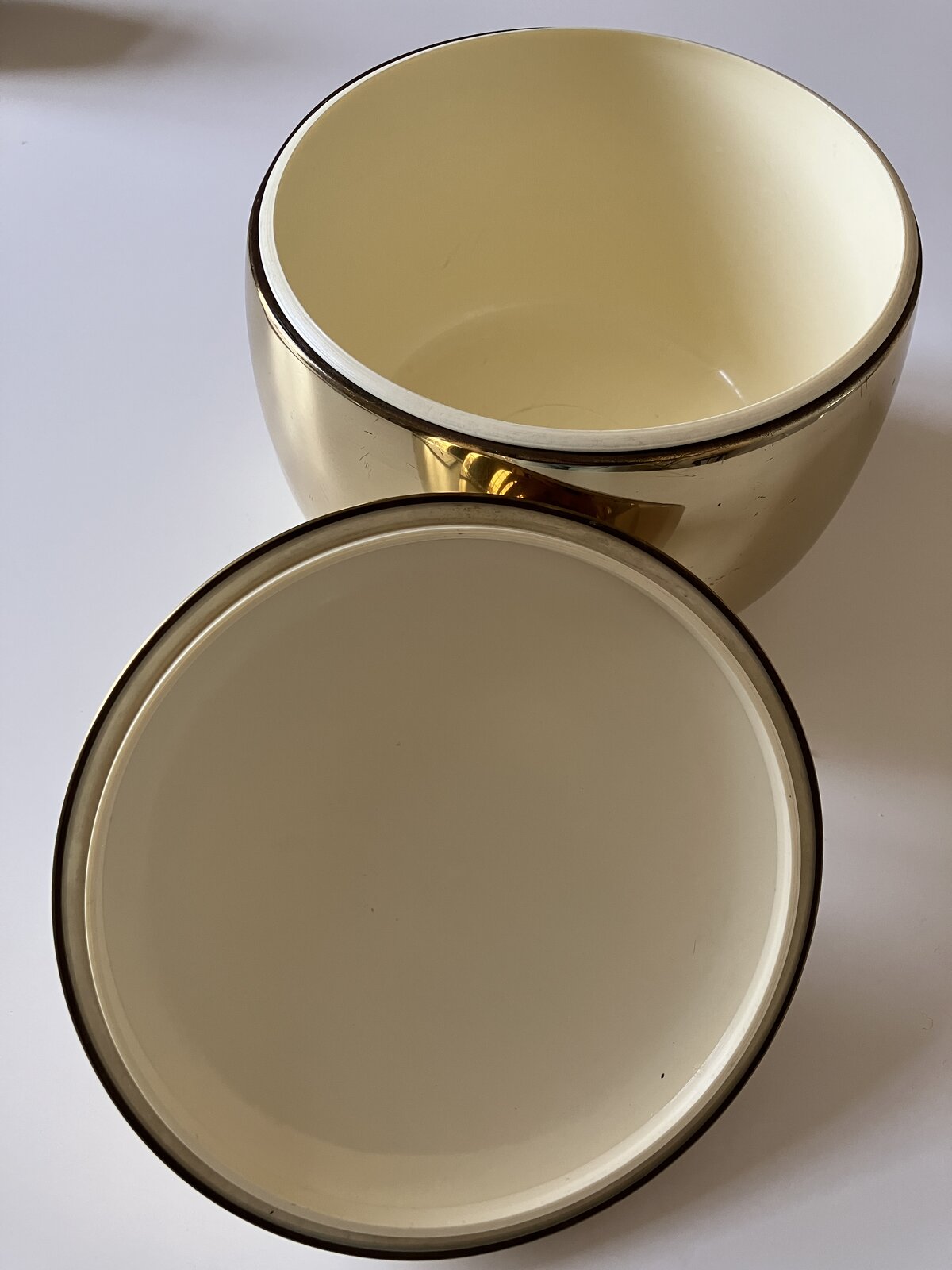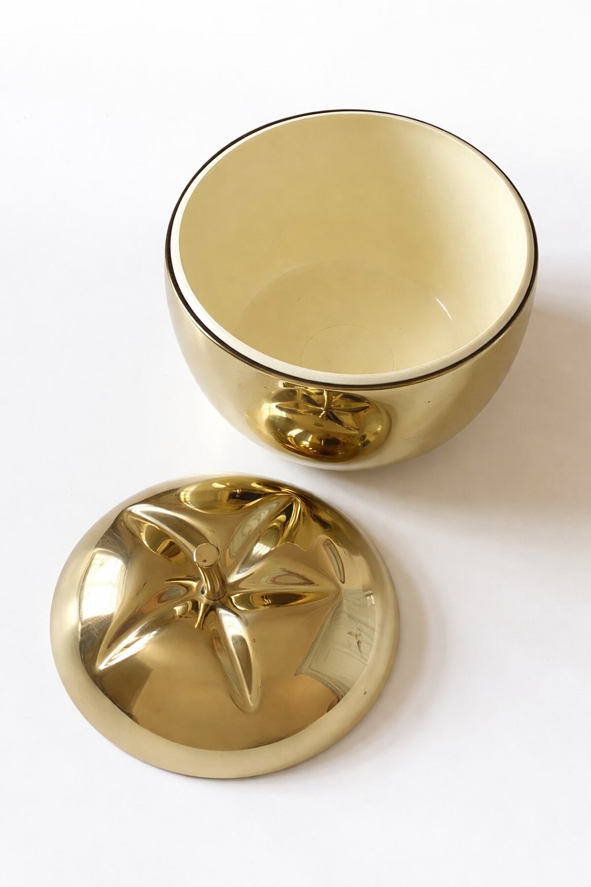 Avec ses lignes généreuses et sculpturales, son métal doré chaleureux et son couvercle surmonté d’une tige sculptée faisant office de poignée, cet objet allie utilité et esthétisme.
