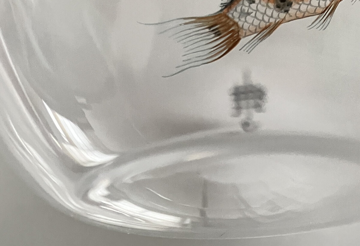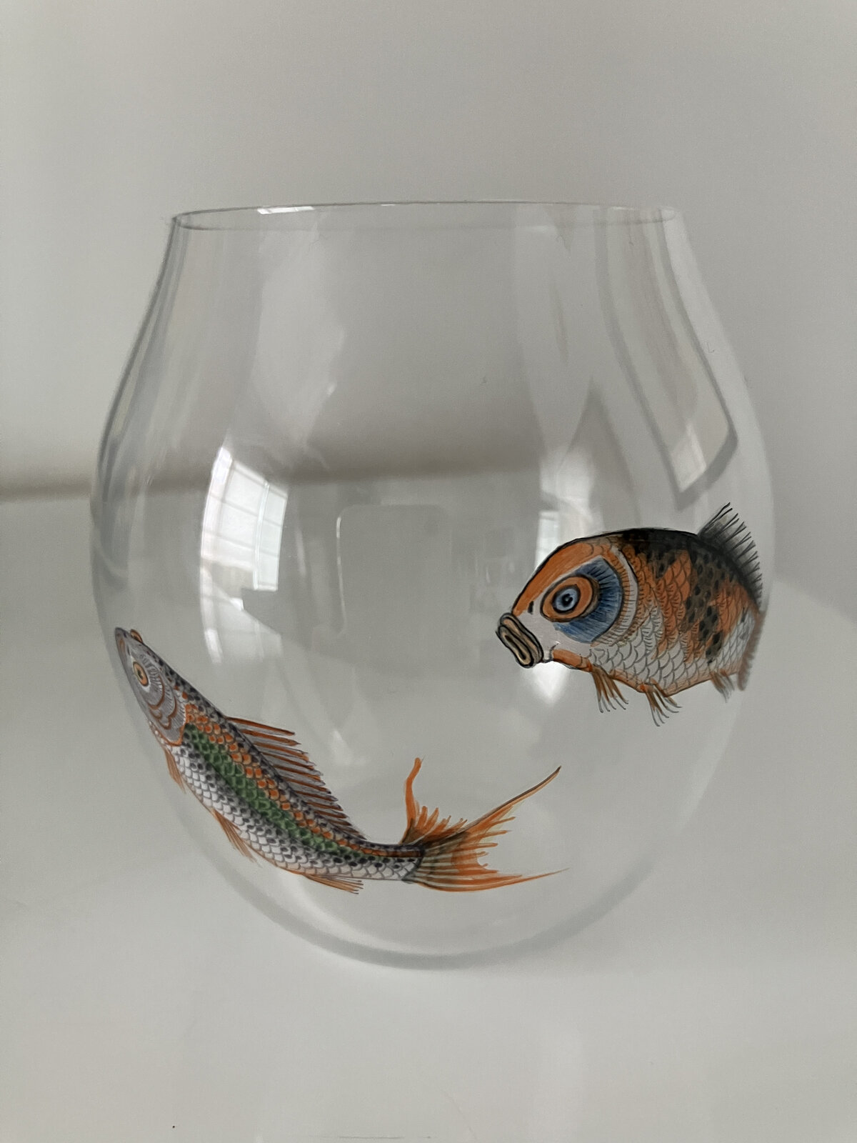 Verre du service n°279 Balloon (gobelet bas, catégorie C pour deux poissons) créé par Ted Muehling, figurant deux poissons peints à la main sur la forme bombée du gobelet avec un pinceau fin et de la peinture émaillée. Le verre est en cristal sans plomb soufflé à la bouche.