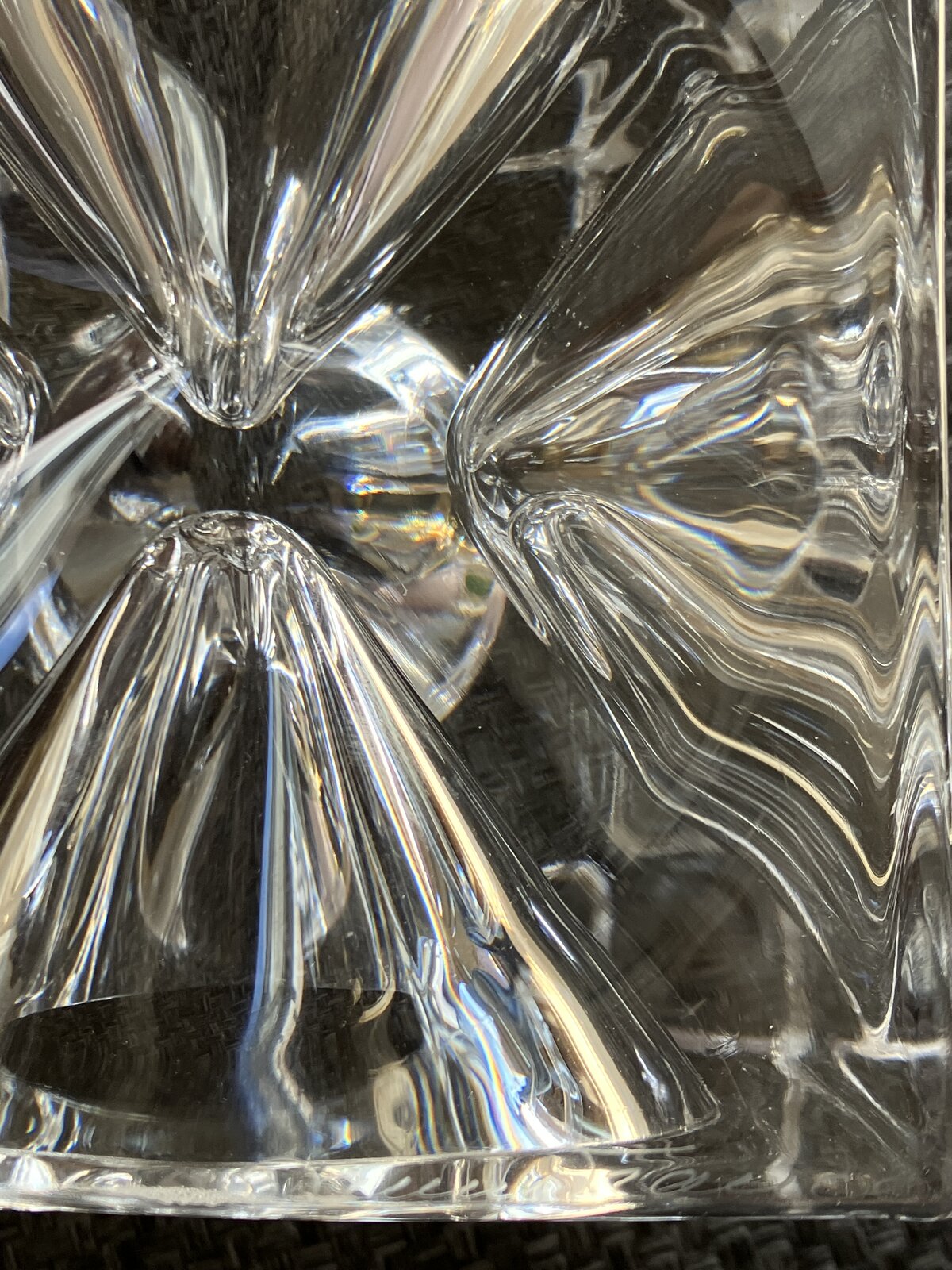 Très élégant cendrier DAUM en cristal transparent de forme cubique, les côtés à détail de sphères concaves.