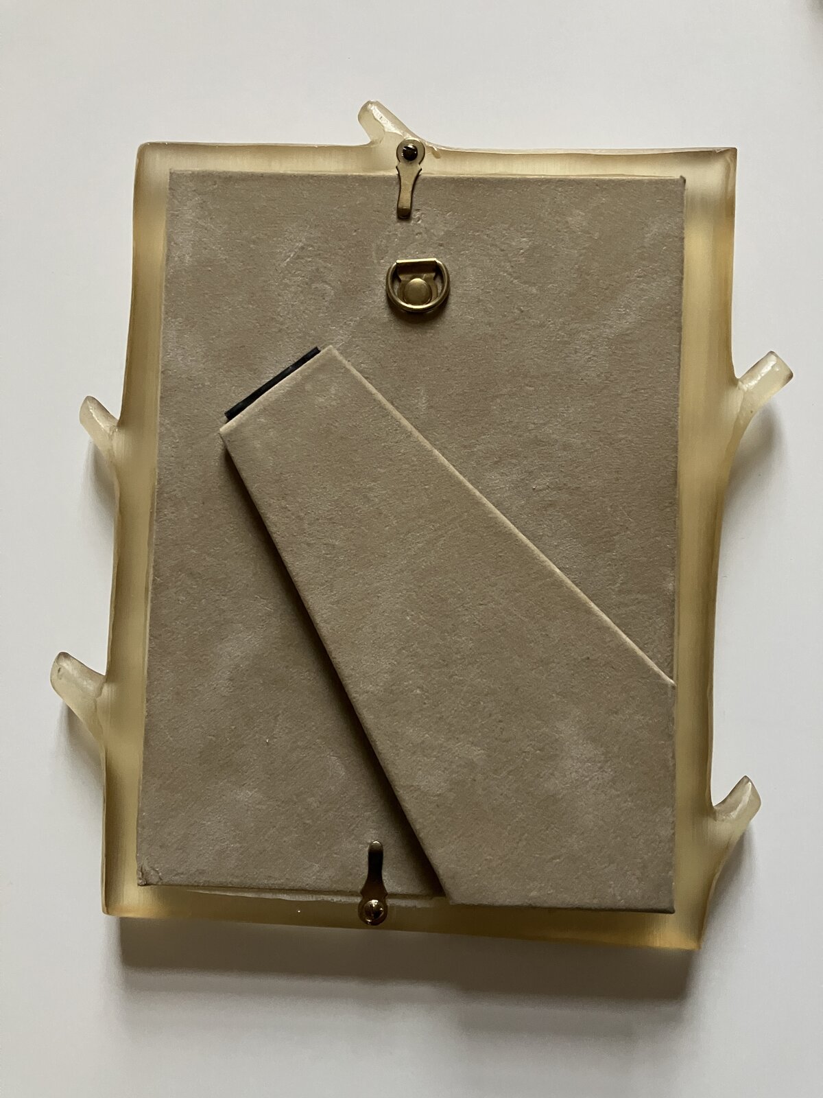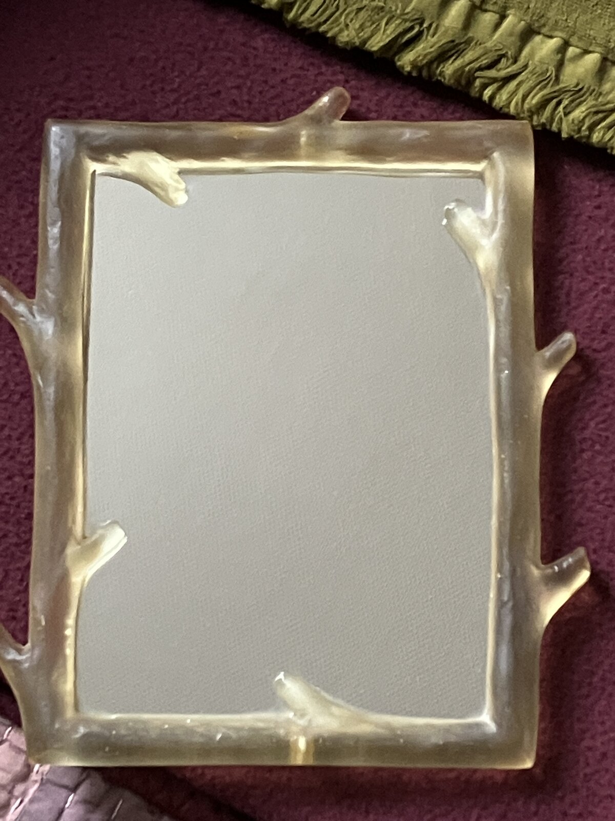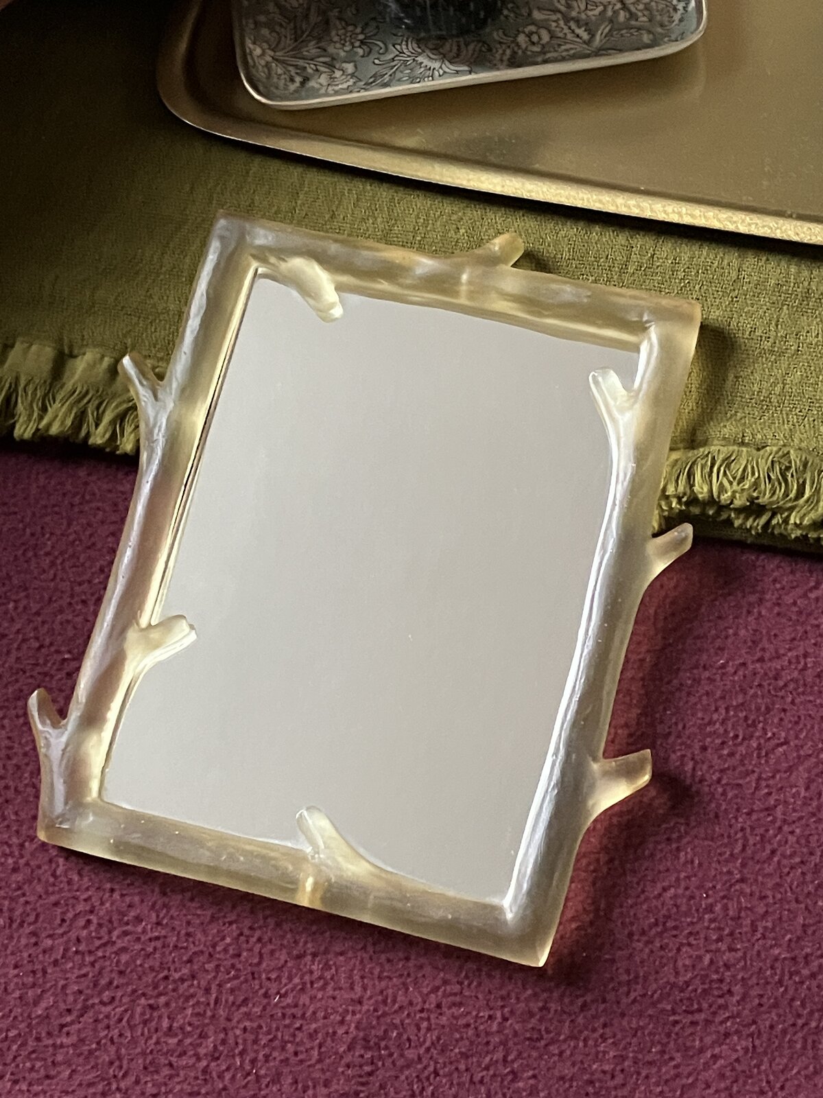 Ce miroir à poser de la maison Martinetti Paris en résine transparente jaune se distingue par son encadrement simulant des branches de corail.