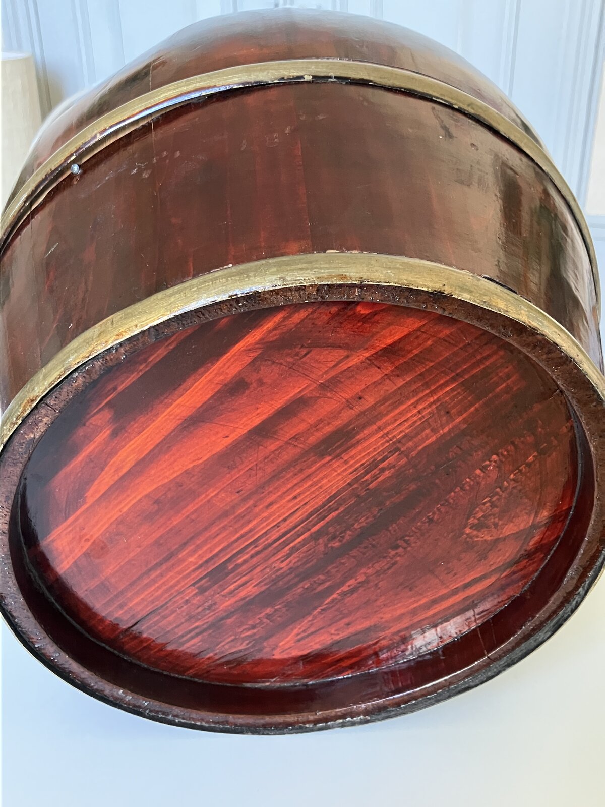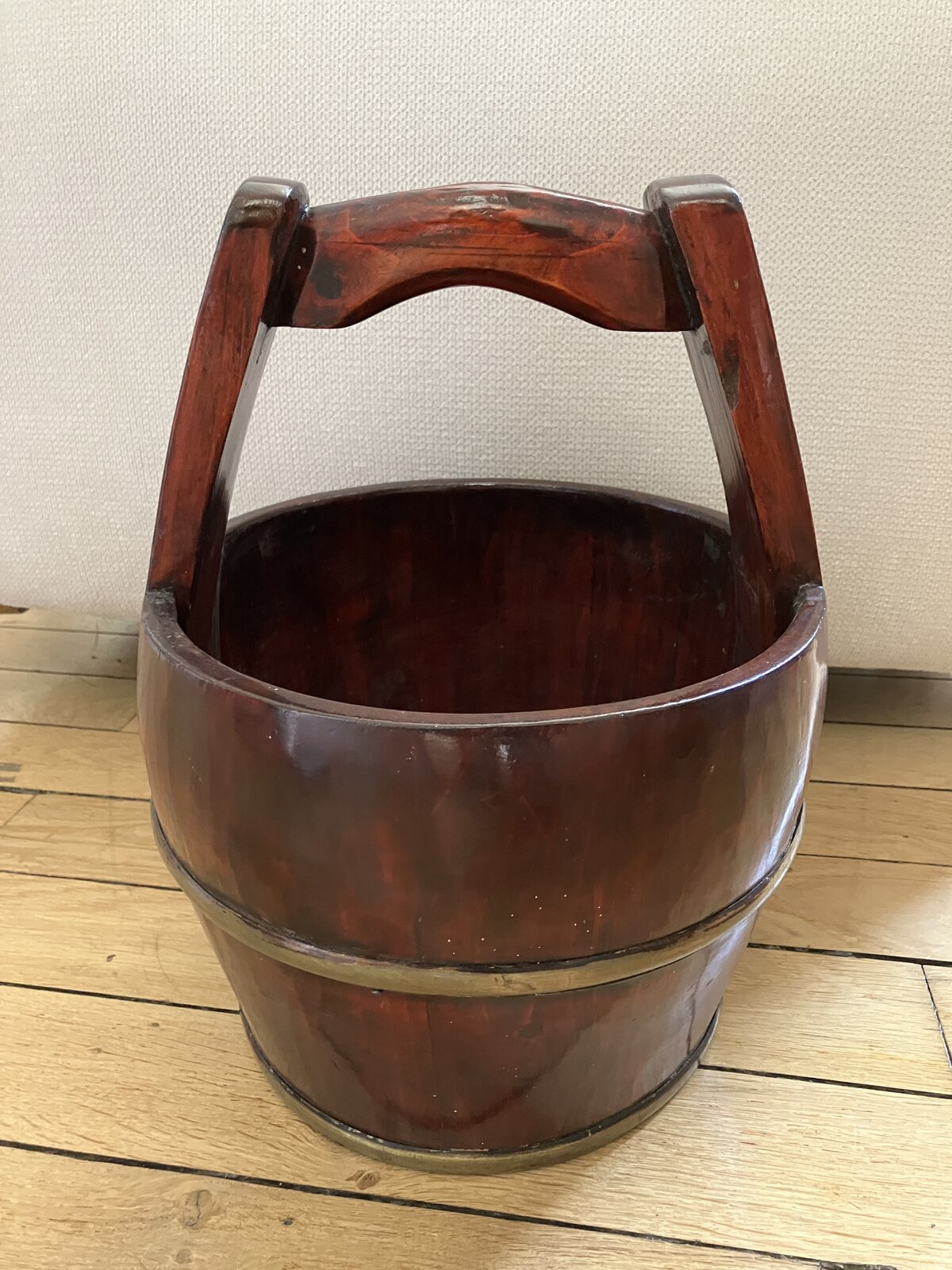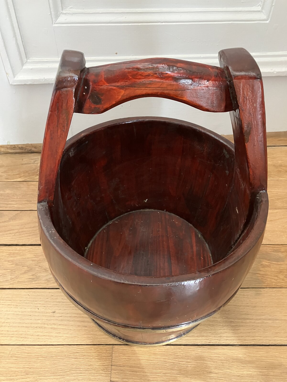Superbe seau traditionnel chinois en bois, entièrement réalisé à la main et recouvert d’une profonde laque rouge — une couleur emblématique dans l’artisanat chinois, symbole de chance et de prospérité.