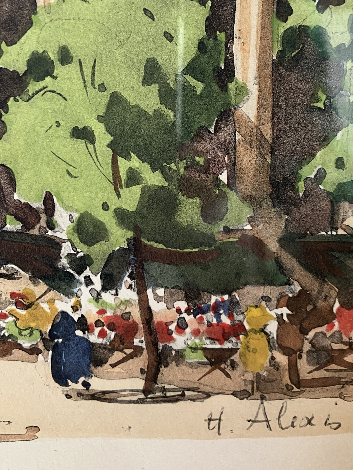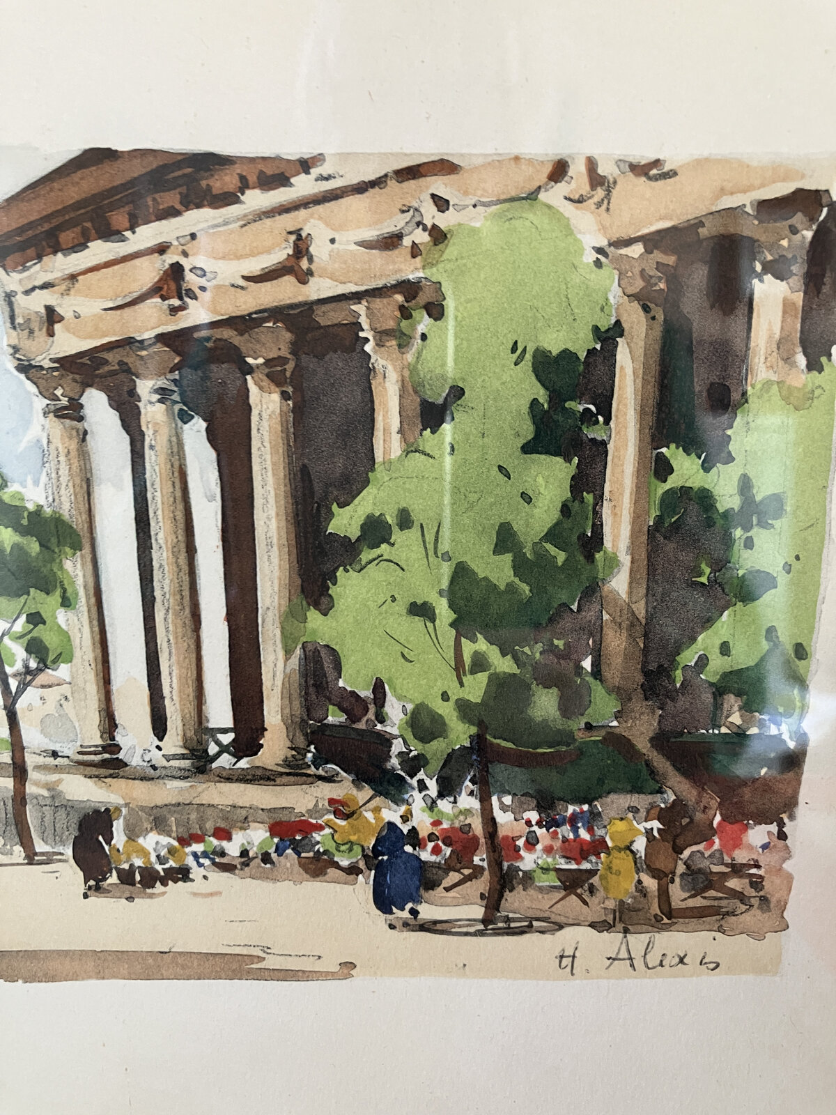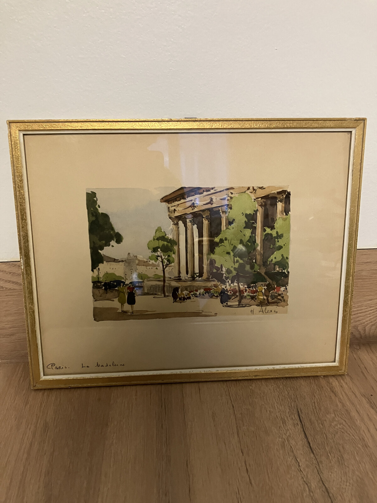 La Madeleine à Paris - Aquarelle sur papier signée H. Alexis et située en bas à gauche, encadrée dans un cadre en bois doré (J. Fortis à Lausanne).