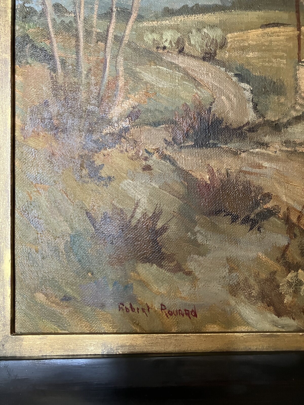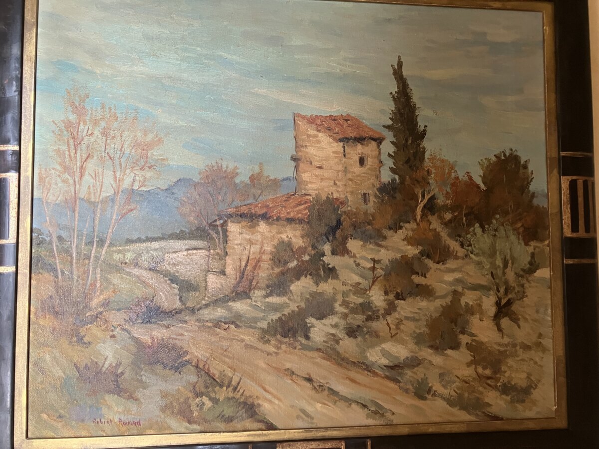 Signée en bas à droite par Robert Rouard (1930–2006), peintre provençal, cette œuvre nous plonge dans l’atmosphère douce et ensoleillée du Sud de la France. On y retrouve une bâtisse typique entourée d’une végétation aux teintes chaudes.